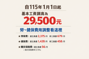 2026-01-01 配合基本工資調整,自 115 年 1 月 1 日起,基本工資調高為新台幣 29,500 元。勞保、健保之月投保薪資亦同步調整為 29,500 元。
