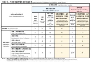 A: 與目前第二類外國人相同,健康檢查項目包括胸部 X 光(肺結核)、身體檢查、梅毒血清檢查、腸內寄生蟲檢查、漢生病檢查、麻疹及德國麻疹抗體或疫苗接種證明。